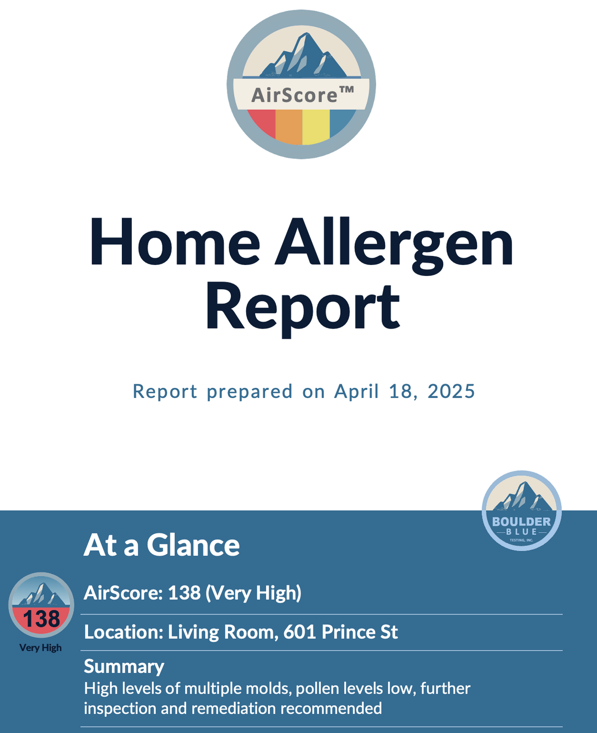 The Boulder Blue Allergen Test reports are built to be detailed, but easy to understand. Each report provides a high-level summary as well as detailed individual results that can be used to determine the best courses of remediation if necessary.