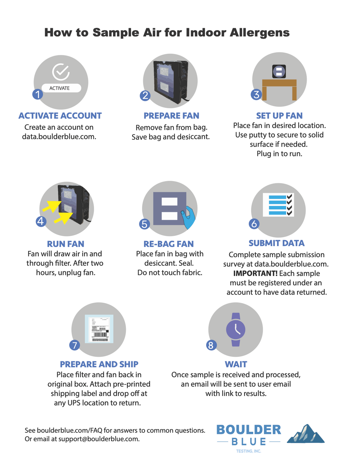The Boulder Blue Home Allergen Test is simple and effective. Users just need to register their kit on-line, run the provided fan for 2 hours, and then ship the unit to our lab. A short time later, users will receive an email notification to view their results.